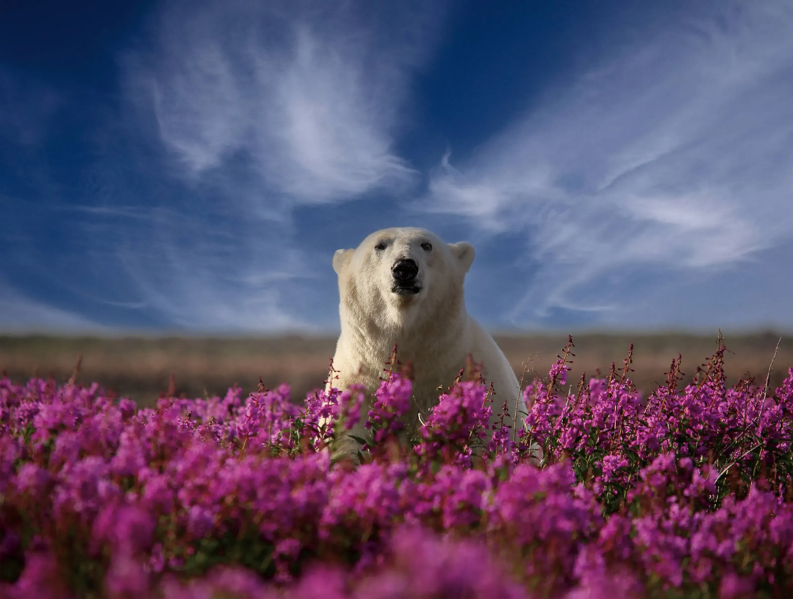 Trek the island on foot, exploring the landscape where polar bears roam through fields of purple fireweed.